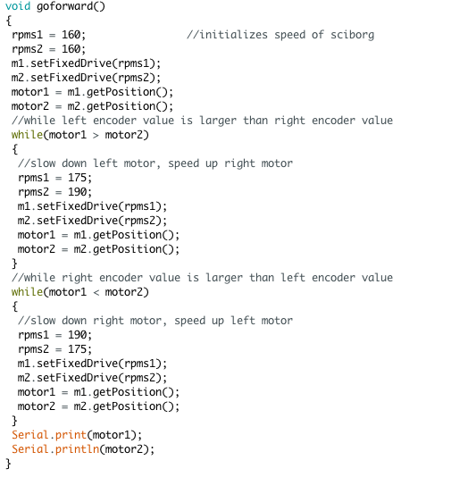Our second go at proportional control was to get our Sciborg to travel exactly 10 feet using the encoder values. In this situation, we took the average of the left and right encoder values and that would tell us how far the sciborg had already traveled. If we knew how much we had left to move, which is the total distance to be driven minus the distance already driven then we could calculate the speed at which the sciborg ought to move. The more distance that was left to travel, the faster the sciborg should move. The gain in this case was 0.015.
